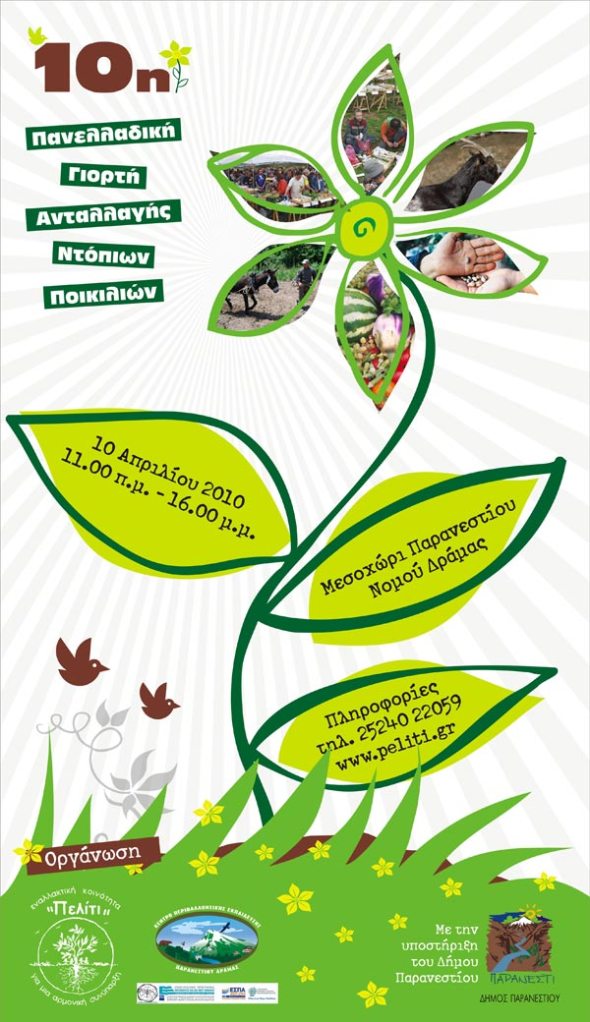 10η Πανελλαδική Γιορτή Ανταλλαγής Ντόπιων Ποικιλιών Posted on 29/03/2010 by ΒΑΣΙΛΑΚΑΚΗΣ Σχολιάστε Πότε : 10 Απριλίου Πού : Μεσοχώρι , Ν.Δράμας διοργανωτές : Πελίτι Κέντρο περιβ/κής εκπαίδευσης πρόγραμμα ιστοσελίδα : http://www.peliti.gr/ Προώθηση Κλικ για αποστολή ενός συνδέσμου μέσω email σε έναν/μία φίλο/η(Ανοίγει σε νέο παράθυρο) Email Κλικ για εκτύπωση(Ανοίγει σε νέο παράθυρο) Εκτύπωση Πατήστε για κοινοποίηση στο Facebook(Ανοίγει σε νέο παράθυρο) Facebook Κάνε κλικ για να μοιραστείς στο X(Ανοίγει σε νέο παράθυρο) Χ Μου αρέσει! Φόρτωση... Σχετικά