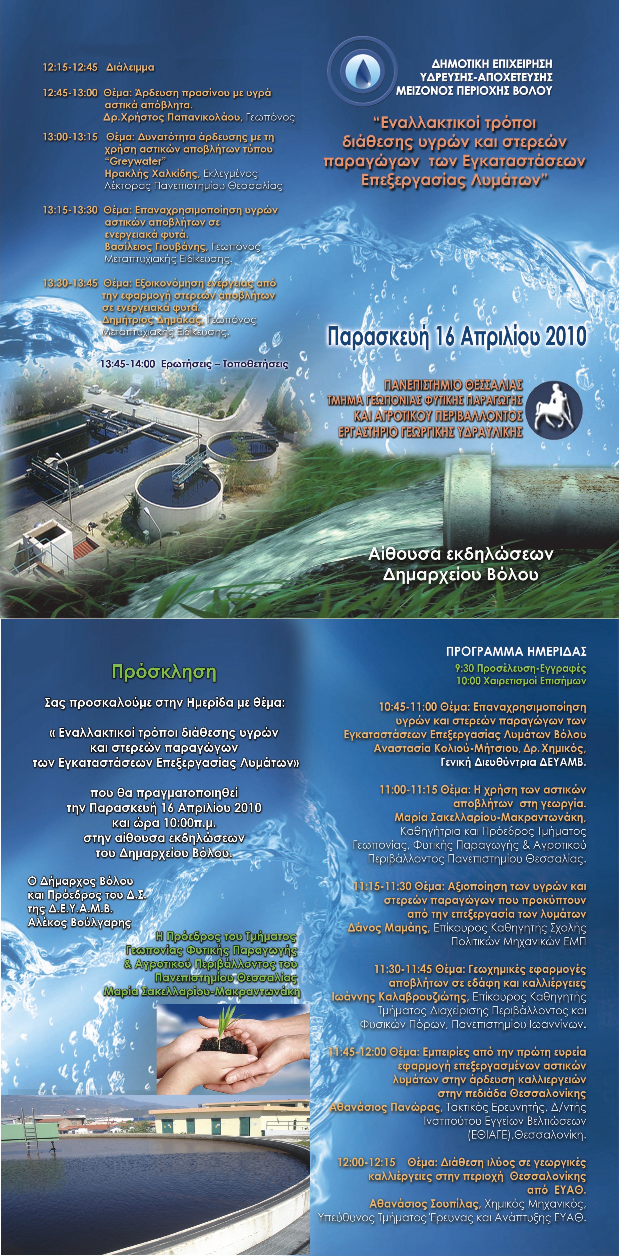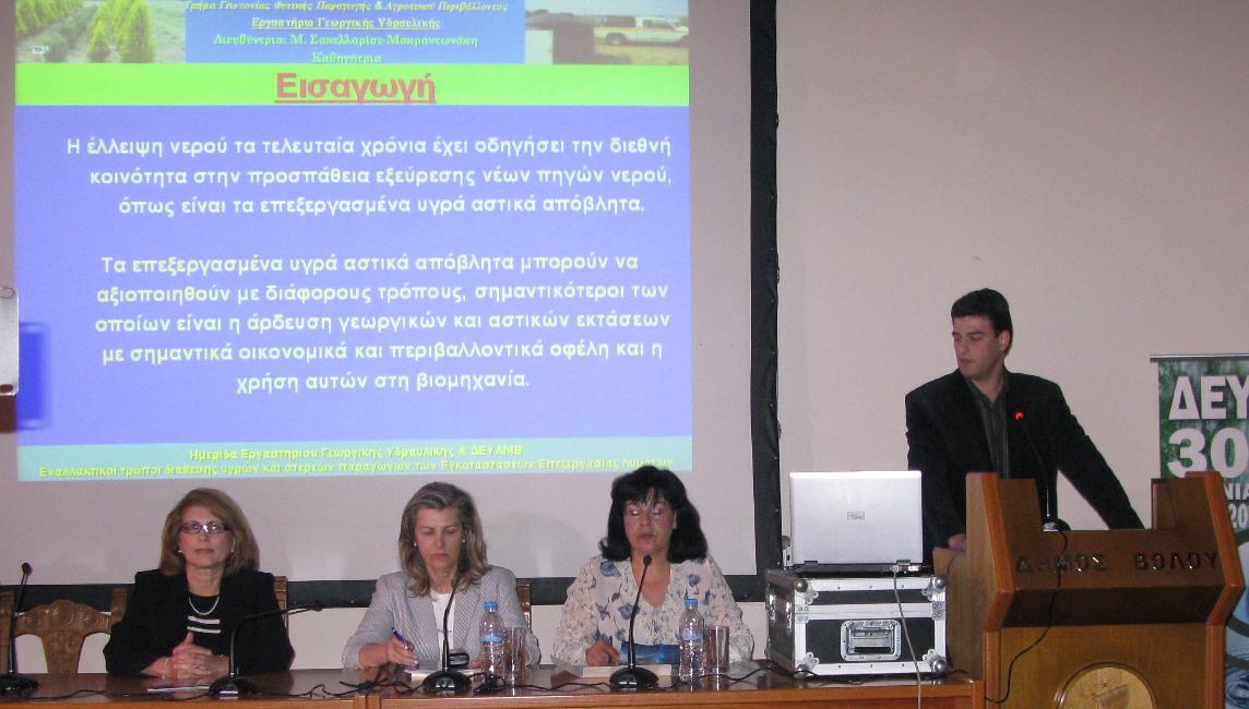 Στην Ημερίδα έγινε λεπτομερής αναφορά και επεξήγηση του τρόπου και των προοπτικων της διάθεσης των υγρών λυμάτων, προέρχομενων απο βιολογικό καθαρισμό, στην άρδευση διάφορων καλλιεργιών όπως επείσης της διάθεσης της λυματολάσπης ως εδαφοβελτιωτικό υλικό .