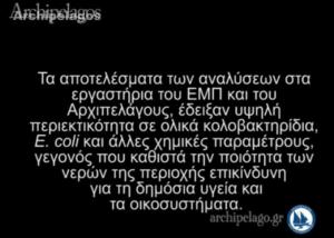 Οι δειγματοληψίες και αναλύσεις δειγμάτων νερού από πηγάδια και γεωτρήσεις, στο εργαστήριο Ανόργανης & Αναλυτικής Χημείας του ΕΜΠ, καθώς και οι μικροβιολογικές αναλύσεις σε δείγματα θαλασσινού νερού στο εργαστήριο του Αρχιπελάγους εμφάνισαν τιμές άνω των επιτρεπτών ορίων και φωτογράφισαν ευκρινώς την πηγή του προβλήματος.