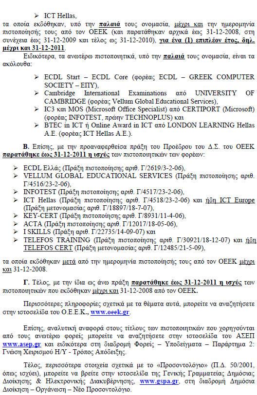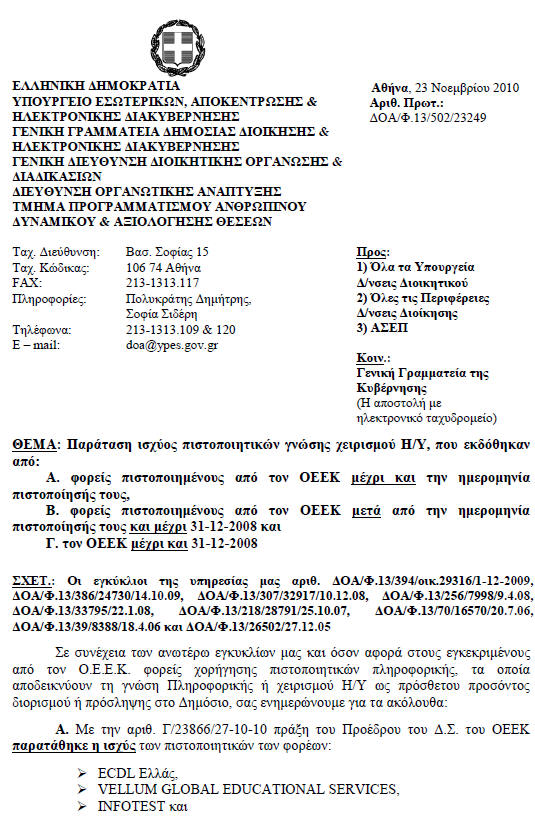 Για άλλο 1 χρόνο αποφάσισε η το Υπουργείο Εσωτερικών , Αποκέντρωσης & ηλεκρ. Διακυβέρνησης να δώσει παράταση στην ισχύ των εξής Πιστοποιητικών γνώσεων στους Η/Υ :