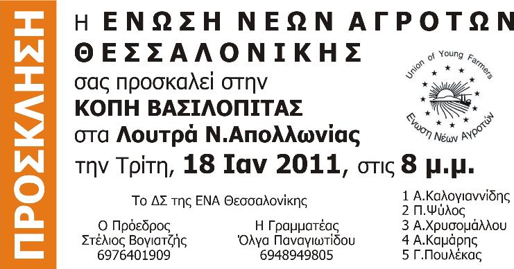 πρόσκληση Νέων Αγροτών Θεσ/νίκης για κοπή Βασιλόπιτας ( 18 Ιανουαρίου):