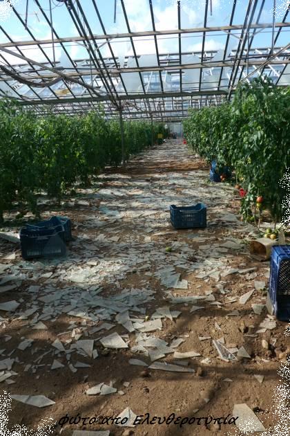 Το χαλάζι, διέλυσε όλα τα θερμοκήπια με τζάμια κάνοντας αδύνατη ακόμα και την είσοδο σε αυτά εξαιτίας των κομματιών τζαμιού, που κρέμονταν από ψηλά και προκάλεσαν χιλιάδες μικρές και μεγάλες οπές αλλά και σκισίματα στα πλαστικά θερμοκήπια.
