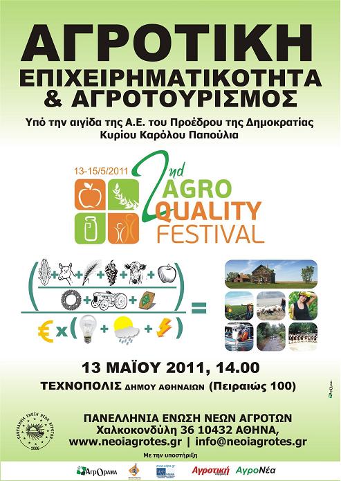 Η Πανελλήνια Ένωση Νέων Αγροτών-ΠΕΝΑ, διοργανώνει εκδήλωση με θέμα «Αγροτική Επιχειρηματικότητα & Αγροτουρισμός» υπό την αιγίδα του Προέδρου της Δημοκρατίας, στα πλαίσια του AGRO QUALITY Φεστιβάλ (13-15/5/2011).