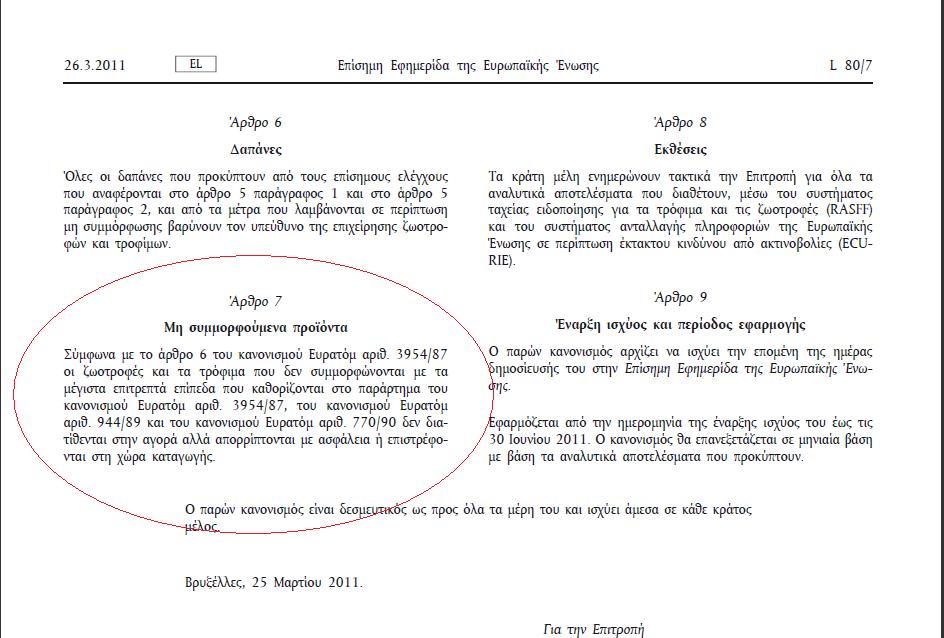 Κανονισμός για όλα τα κράτη της ΕΕ για την επιβολή ειδικών όρων που διέπουν την εισαγωγή ζωοτροφών και τροφίμων καταγωγής ή προέλευσης Ιαπωνίας μετά το ατύχημα στον πυρηνικό σταθμό της Φουκουσίμα εξεδώθηκε απο την Ευρωπαϊκή Ένωση .