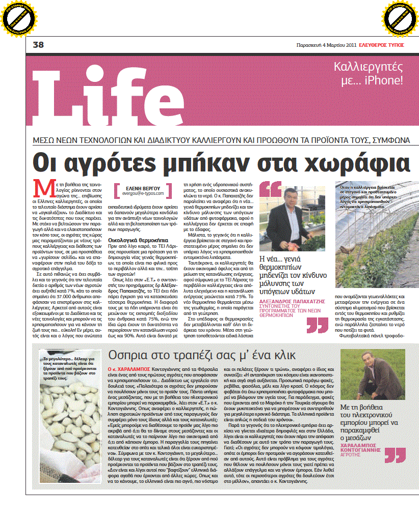 Μ’ αυτό τον τίτλο, στη σελίδα 38 της εφημερίδας “Ελεύθερος Τύπος” της Παρασκευής 4 Μαρτίου 2011, ξεκινάει το αφιέρωμα στην προσπάθεια που κάνει o παραγωγός Χαράλαμπος Κοντογιάννης για την πώληση των αγροτικών προϊόντων κατευθείαν στους καταναλωτές, χωρίς τη μεσολάβηση κανενός εμπόρου ή μεσάζοντα, μέσω του ίντερνετ και της ιστοσελίδας www.kontogiannis.eu.
