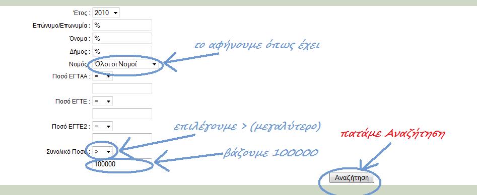 - πατάμε αναζήτηση και βγαίνουν κάτω κάτω όλα τα ονόματα που πήραν επιδότηση για το το 2010 άνω των 100.000 € σε όλη την Ελλάδα