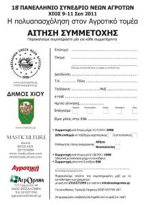 18ο Συνέδριο Νέων Αγροτών Posted on 15/07/2011 by ΒΑΣΙΛΑΚΑΚΗΣ Σχολιάστε Την πορεία της προετοιμασίας του 18ου Πανελληνίου Συνεδρίου Νέων Αγροτών εξέτασε το Διοικητικό Συμβούλιο της ΠΕΝΑ κατά την συνεδρίαση της 7/7/2011 (Αθήνα) . πότε θα γίνει : 9 – 11 Σεπτεμβρίου πού : Χίος .. .. διαβάστε όλο το Προώθηση Στείλε ένα σύνδεσμο σε έναν φίλο(Ανοίγει σε νέο παράθυρο) Email Εκτύπωση(Ανοίγει σε νέο παράθυρο) Εκτύπωση Mοιραστείτε στο Facebook(Ανοίγει σε νέο παράθυρο) Facebook Μοιραστείτε στο X(Ανοίγει σε νέο παράθυρο) Χ Μου αρέσει! Φόρτωση... Σχετικά