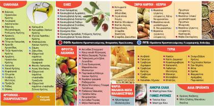 Μέχρι στιγμής έχουν αναγνωριστεί 65 ελληνικά ΠΟΠ και 23 ΠΓΕ, εκ των οποίων τα περισσότερα είναι τυριά, ελαιόλαδα ή ελιές. Στον κατάλογο έχουν αναγνωριστεί ορισμένα φρούτα νωπά ή ξερά, όσπρια, λαχανικά, αλλά και αβγοτάραχο, μέλι, μαστίχα ή τσίχλες από , ξηροί καρποί, μαστιχέλαιο κ.ά.