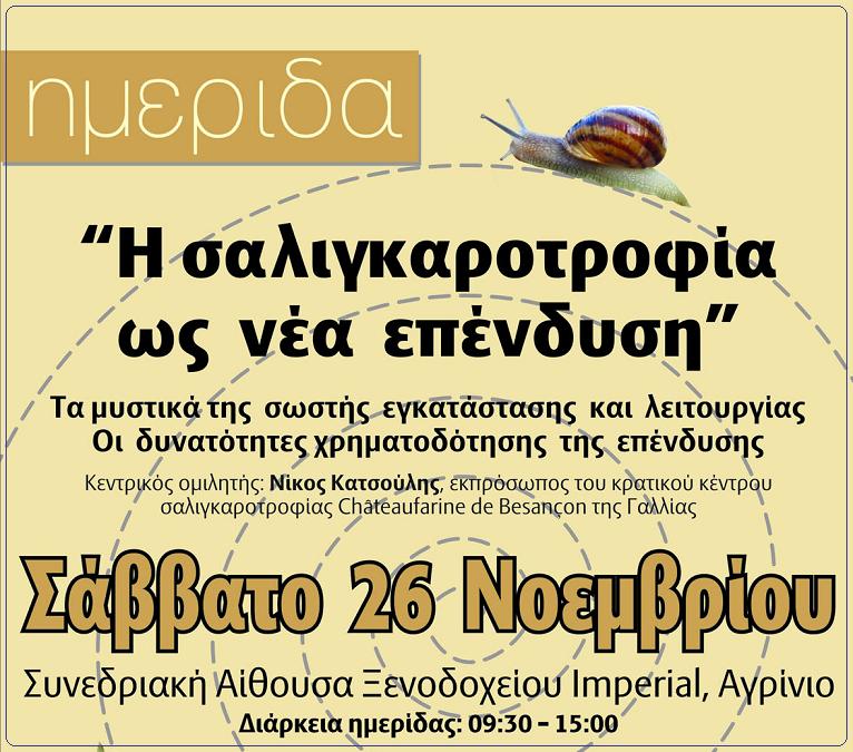 Ημερίδα σαλιγκαροτροφίας Posted on 21/11/2011 by ΒΑΣΙΛΑΚΑΚΗΣ Σχολιάστε Ημερίδα θα πραγματοποιηθεί με θέμα : την Σαλιγκαροτροφία Aγρίνιο ξενοδοχείο Imrerial … & 26 Noεμβρίου ώρα 9.30 πμ .. Ομιλητής : Νίκος Κατσούλης, εκπρόσωπος του κέντρου Cheteaufarine de Besancon της Γαλλίας Πληροφορίες : τηλ 6988712296 Προώθηση Κλικ για αποστολή ενός συνδέσμου μέσω email σε έναν/μία φίλο/η(Ανοίγει σε νέο παράθυρο) Email Κλικ για εκτύπωση(Ανοίγει σε νέο παράθυρο) Εκτύπωση Πατήστε για κοινοποίηση στο Facebook(Ανοίγει σε νέο παράθυρο) Facebook Κάνε κλικ για να μοιραστείς στο X(Ανοίγει σε νέο παράθυρο) Χ Μου αρέσει! Φόρτωση... Σχετικά