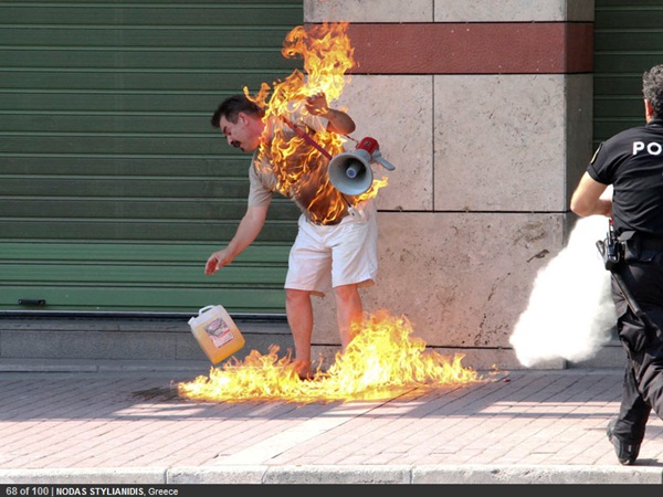 Η συγκεκριμένη φωτογραφία αποθανατίζει έναν ταλαίπωρο δανειολήπτη που μόλις αυτοπυρπολύθηκε μπροστά στο υποκατάστημα της Τράπεζας Πειραιώς (γωνία Τσιμισκή & Εθνικής Αμύνης στην Θεσ/νίκη) λόγω χρεών .