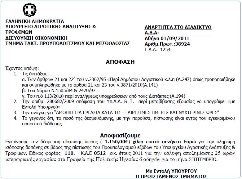 Σύμφωνα με απόφαση ( κλίκ εδώ) για τον μήνα Σεπτέμβριο το Υπουργείο έδωσε σε 6 οδηγούς που εργαζόταν στα Γραφεία της πολιτικής ηγεσίας για 25 ώρες το ποσό των 1150 € .