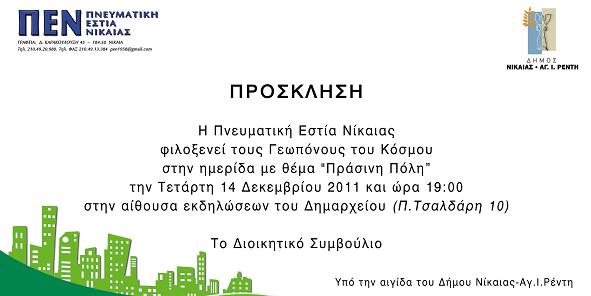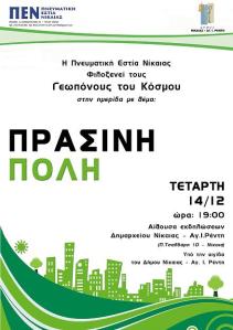 Πράσινη πόλη απο τους γεωπόνους του κόσμου Posted on 05/12/2011 by ΒΑΣΙΛΑΚΑΚΗΣ 1 σχόλιο Ημερίδα : Πράσινη πόλη Αθήνα αίθουσα Δημαρχείου Νίκαιας – Ρέντη Τσαλδάρη 10 – Νίκαια … & 14 Δεκεμβρίου ώρα 7 μμ Ομιλητές : Κατσουλάκος Ελευθέριος, Msc Γεωπόνος Μελετητής Κουτσογιάννη Σταυρούλα, Msc Γεωπόνος Αρχιτέκτων Τοπίου Σεκλιζιώτης Σταμάτης, Δρ Γεωπόνος Αρχιτέκτων Τοπίου Καρέστος Γεώργιος, Δασολόγος Ερευνητής ΕΛ.Γ.Ο. Δήμητρα Πάγκαλου Έλλη, Msc Αρχιτέκτων Τοπίου Προώθηση Κλικ για αποστολή ενός συνδέσμου μέσω email σε έναν/μία φίλο/η(Ανοίγει σε νέο παράθυρο) Email Κλικ για εκτύπωση(Ανοίγει σε νέο παράθυρο) Εκτύπωση Πατήστε για κοινοποίηση στο Facebook(Ανοίγει σε νέο παράθυρο) Facebook Κάνε κλικ για να μοιραστείς στο X(Ανοίγει σε νέο παράθυρο) Χ Μου αρέσει! Φόρτωση... Σχετικά