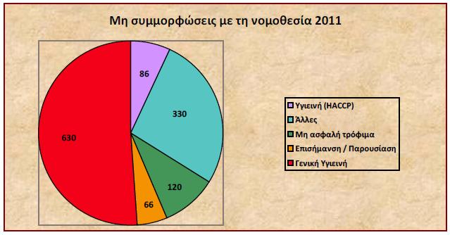 • Έχουν επιβληθεί 487 πρόστιμα συνολικού ύψους € 3.813.000. Τα μεγαλύτερα σε ύψος πρόστιμα έχουν επιβληθεί σε μεγάλες αλυσίδες σούπερ μάρκετ και έπονται βιομηχανίες και βιοτεχνίες επεξεργασίας τροφίμων.