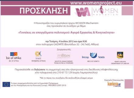 Με πολύ χαρά άκουσα (από την κα Δήμητρα) ότι την Τετάρτη, 4 Ιουλ 2012, στις 09.30, στον χώρο Gazarte (Γκάζι, Αθηνών) η ΜΙΛΗΤΟΣ οργανώνει συνέδριο, με θέμα «Γυναίκες σε επαγγέλματα πολιτισμού: Αγορά εργασίας και κινητικότητα».