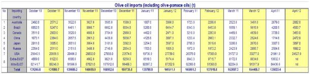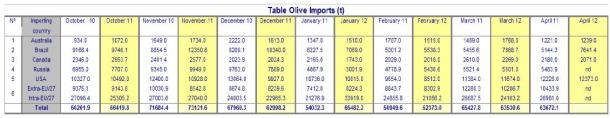 Τα στοιχεία που αναφέρονται στο επόμενο πίνακα προκύπτουν απο τις εισαγωγές επιτραπέζιων ελιών κατά τους πρώτους επτά μήνες της σεζόν 2011/12 (Οκτώβριος-Απρίλιος), αυξήθηκαν μόνο στη Βραζιλία (26%).