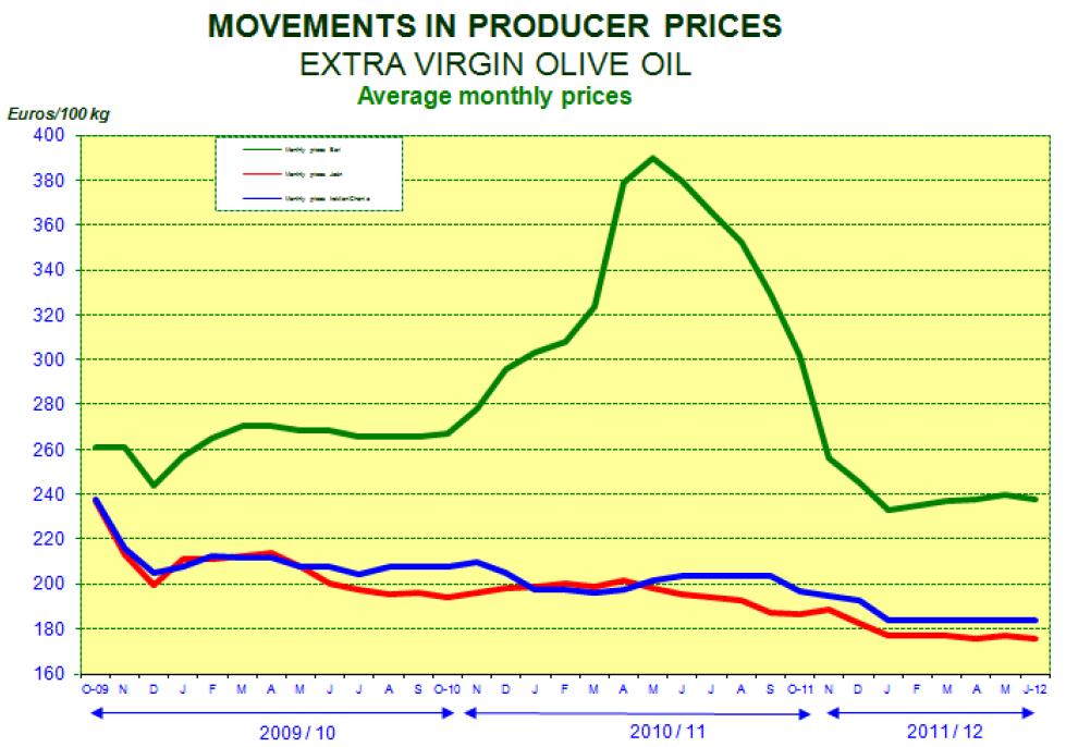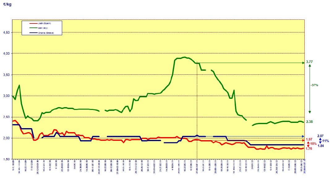 Το εξαιρετικό παρθένο ελαιόλαδο: Σε σύγκριση με την ίδια περίοδο του προηγούμενου έτους, οι τιμές μειώθηκαν κατά 10% στην Ισπανία (€ 1.76/kg), 11% στην Ελλάδα (€ 1.84/kg) και 37% στην Ιταλία (€ 2.38/kg ) (βλ. διάγραμμα 1).