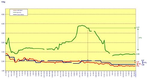 Τους τελευταίους μήνες, οι τιμές παρέμειναν σχεδόν σταθερές σε όλες τις τρεις χώρες, αλλά εξακολουθούν να παραμένουν στα χαμηλότερα επίπεδα από τον Οκτώβριο του 2009