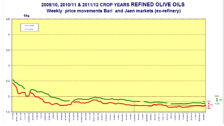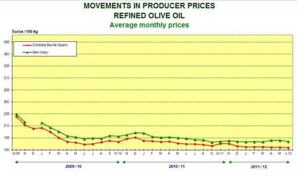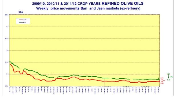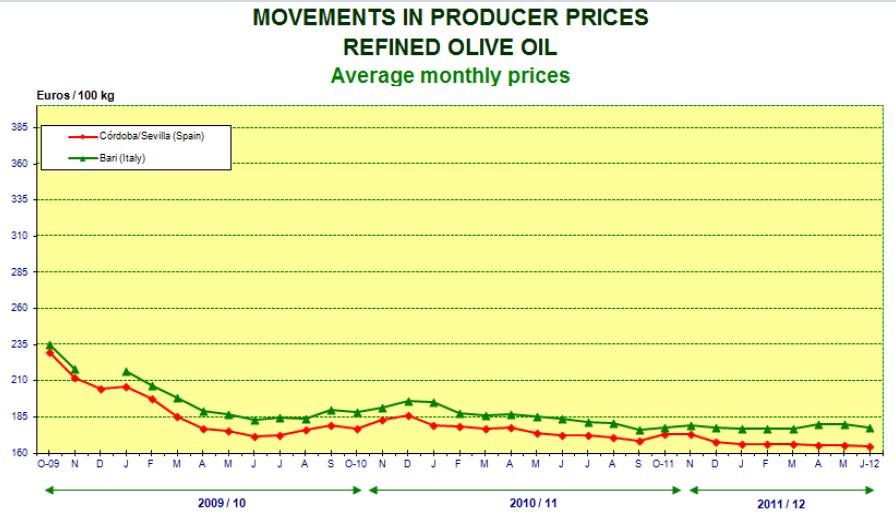 Εξευγενισμένο ελαιόλαδο: Κατά τη διάρκεια των τελευταίων 12 μηνών, στα ραφιναρισμένα ελαιόλαδα οι τιμές έχουν μειωθεί κατά 1% (€ 1.69/kg) στην Ισπανία και 3% (€ 1.78/kg) στην Ιταλία (Γράφημα 3). Οι τιμές βρίσκονται σε χαμηλότερα επίπεδα τους τα τελευταία τρία χρόνια καλλιέργειας. Δεν υπάρχουν στοιχεία για τις τιμές στην Ελλάδα. Η διαφορά μεταξύ της τιμής του εξευγενισμένου ελαιολάδου και έξτρα παρθένου ελαιόλαδου είναι σήμερα περίπου € 0.07/kg στην Ισπανία και € 0.60/kg στην Ιταλία.