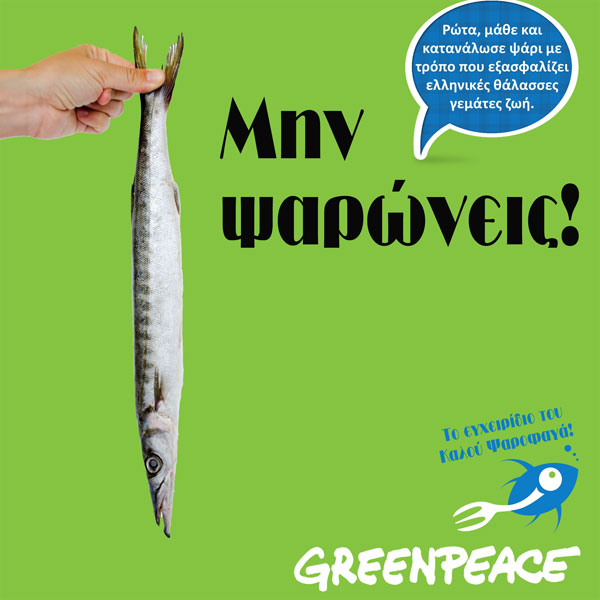 Ρώτα, μάθε και κατανάλωσε ψάρι με τρόπο που εξασφαλίζει ελληνικές θάλασσες γεμάτες ζωή! Χρησιμοποίησε το «Εγχειρίδιο του καλού Ψαροφαγά» της Greenpeace και με τη δύναμη που έχεις ως καταναλωτής, σπάσε το μονοπώλιο της καταστροφικής μηχανότρατας στην αγορά και διεκδίκησε πρόσβαση σε ψάρι που έχει αλιευθεί με βιώσιμο τρόπο από Έλληνες παράκτιους ψαράδες.