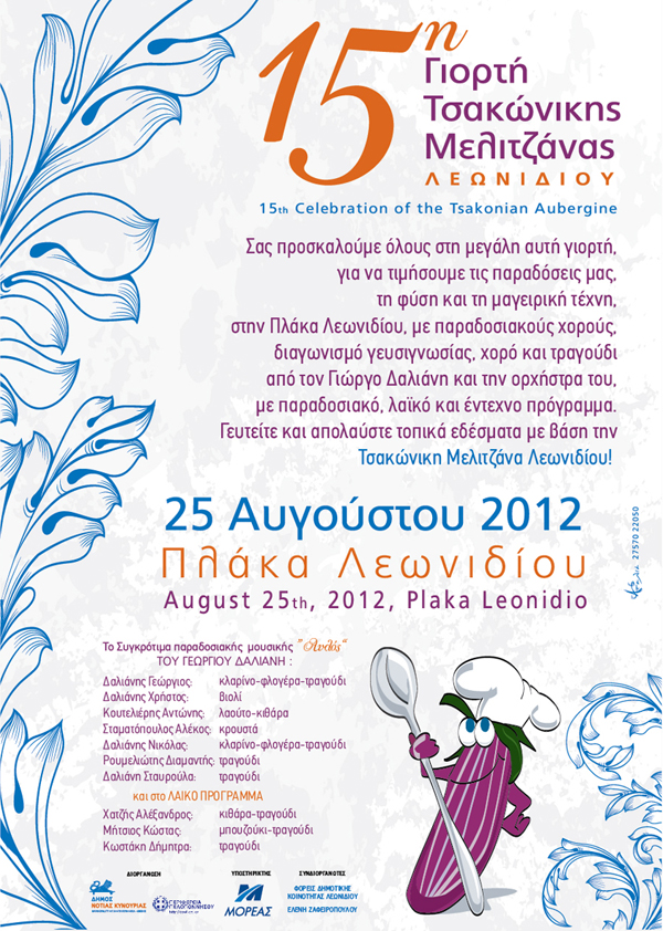 15η Γιορτή Τσακώνικης Μελιτσάνας Posted on 22/08/2012 by ΒΑΣΙΛΑΚΑΚΗΣ Σχολιάστε Γιορτή Τσακώνικης Μελιτσάνας Λεωνίδιο Κυνουρίας περιοχή Πλάκας … & 25 Αγούστου ώρα 19.30 διοργανωτής: Δήμος Νότιας Κυνουρίας * Θα πραγματοποιηθεί διαγωνισμός φαγητού με βάση την Τσακώνικη Μελιτζάνα Λεωνιδίου. * Οι επισκέπτες θα δοκιμάσουν εδέσματα μελιτζάνας και θα ζήσουν από κοντά την αυθεντική φιλοξενία του τόπου και τα γνήσια προϊόντα της τσακώνικης γης. * Η εκδήλωση θα ολοκληρωθεί με μουσική χορό και τραγουδι Προώθηση Κλικ για αποστολή ενός συνδέσμου μέσω email σε έναν/μία φίλο/η(Ανοίγει σε νέο παράθυρο) Email Κλικ για εκτύπωση(Ανοίγει σε νέο παράθυρο) Εκτύπωση Πατήστε για κοινοποίηση στο Facebook(Ανοίγει σε νέο παράθυρο) Facebook Κάνε κλικ για να μοιραστείς στο X(Ανοίγει σε νέο παράθυρο) Χ Μου αρέσει! Φόρτωση... Σχετικά
