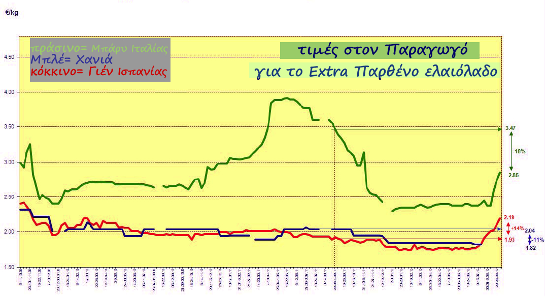 Η έκθεση του Διεθνές Συμβουλίου Ελαιολάδου (International Olive Council) για τον Μήνα Αύγουστο αναφέρει ότι οι τιμές στην Ελλάδα όχι μόνο αυξήθηκαν, αλλά στα Χανιά έχουμε μείωση κατα 11 % της τιμής στον παραγωγό σε σχέση με πέρσυ.