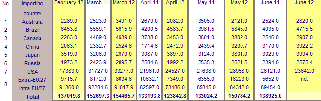 Μεταξύ των οκτώ χωρών που αναφέρονται στον παρακάτω πίνακα, οι εισαγωγές του ελαιολάδου και του πυρηνελαίου αυξήθηκαν τους πρώτους 9 μήνες του 2011/12 (Οκτώβριος-Ιούνιος), στην Κίνα (+25%), την Ιαπωνία (14%), τη Βραζιλία (+10%), τη Ρωσία