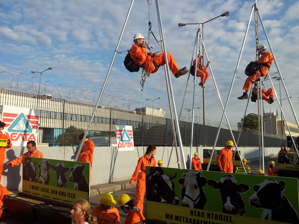 30 ακτιβιστές της Greenpeace βρίσκονται αυτή τη στιγμή έξω από τις εγκαταστάσεις της εταιρείας ΔΕΛΤΑ, στήνοντας ένα ανθρώπινο οδόφραγμα μπροστά από την εταιρεία. Απαιτούν μαζί με περισσότερους από 51.000 καταναλωτές να επενδύσει τώρα που ξεκινάει η καλλιεργητική περίοδος, σε ντόπια κτηνοτροφικά φυτά, όπως το κουκί και το ρεβίθι, για ελληνικές, μη μεταλλαγμένες ζωοτροφές!
