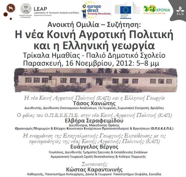 Την Παρασκευή, 16 Νοε 2012, στις 17.00, στα Τρίκαλα Ημαθίας (παλαιό Δημοτικό Σχολείο) οργανώνεται συζήτηση για την Νέα Κοινή Γεωργική Πολιτική και την Ελληνική Γεωργία. Στην συζήτηση θα μετέχει ο Δρ Τάσος Χανιώτης, η Δ/τρια Ελβίρα Σεραφειμίδου και ο Δρ Ευάγγελος Βέργος με συντονιστή τον καθ Κώστα Καραντινινή.