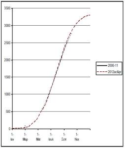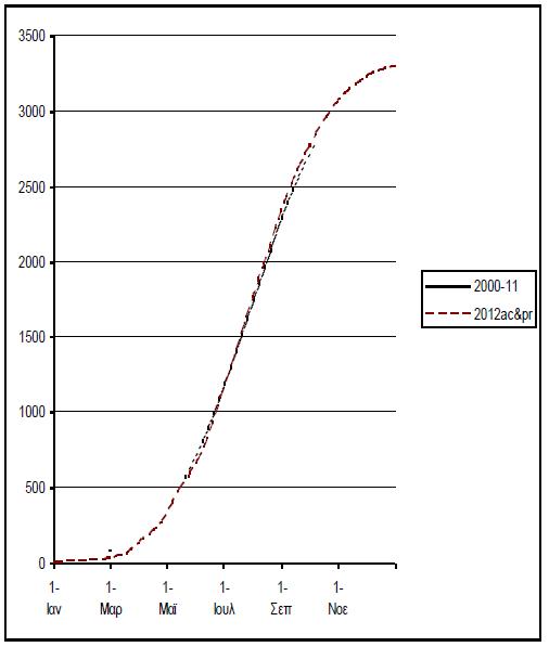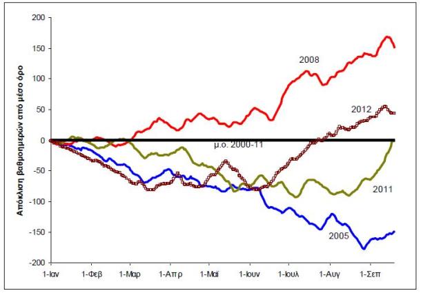 Καλύτερη σύγκριση των διαφορετικών ετών μπορεί να γίνει με το δεύτερο σχήμα που παρουσιάζει την ημερήσια απόκλιση των ημεροβαθμών ανάπτυξης του έτους 2012 από τον μέσο όρο της περιόδου 2000-2011. Ο μέσος όρος της περιόδου παρουσιάζεται από την οριζόντια γραμμή που διέρχεται από την αρχή των αξόνων (μηδέν), ενώ η απόκλιση παρουσιάζεται για το διάστημα από τις αρχές του Ιανουαρίου έως το τέλος Σεπτεμβρίου κάθε έτους. Στο σχήμα παρουσιάζονται, επιπρόσθετα και ενδεικτικά, τα αντίστοιχα στοιχεία για
