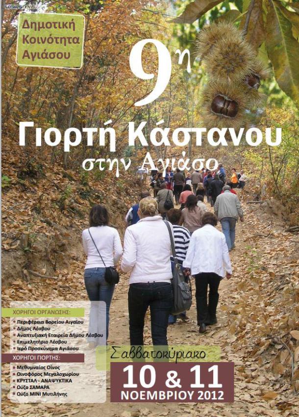 Η Δημοτική Κοινότητα Αγιάσου διοργανώνει την προσεχή Κυριακή, 11 Νοεμβρίου 2012, στην Αγιάσο την 9η Γιορτή Κάστανου με τη συνεργασία του Αναγνωστηρίου Αγιάσου «Η Ανάπτυξη», του Σώματος Ελλήνων Προσκόπων, του Συλλόγου Εμπόρων-Επαγγελματοβιοτεχνών Αγιάσου «Ο ΕΡΜΗΣ», του Αγροτικού Συλλόγου Αγιάσου, του Αγροτομεταποιητικού Συνεταιρισμού Γυναικών Αγιάσου και του Συλλόγου Καβαλαραίων Αγιάσου «Ο Προφήτης Ηλίας».