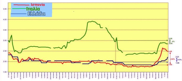 Στο παρακάτω διάγραμμα παρακολουθείτε τις εβδομαδιαίες μεταβολές των τιμών που καταβάλλονται στους παραγωγούς για το εξαιρετικό παρθένο ελαιόλαδο στις κορυφαίες χώρες παραγωγής της ΕΕ .