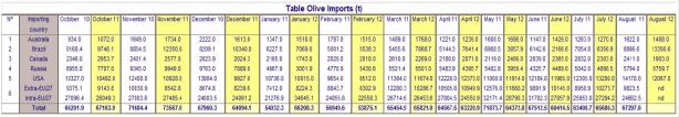 Τα στοιχεία που αναφέρονται στο επόμενο πίνακα δείχνουν ότι οι εισαγωγές επιτραπέζιων ελιών, το χρονικό διάστημα Οκτώβριος 2011 –Αυγούστου 2012 , αυξήθηκαν κατά 12% στην Βραζιλία και μειώθηκαν κατά -5% τόσο στη Ρωσία όσο και στις Ηνωμένες Πολιτείες και κατά -2% στον Καναδά.