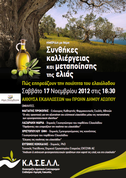 «Συνθήκες καλλιέργειας και μεταποίησης της ελιάς» – πώς επηρεάζουν την ποιότητα του ελαιολάδου, είναι το θέμα της ημερίδας που διοργανώνει η κοινοπραξία Αγροτικών Συνεταιρισμών Επιδαύρου- Λιμηράς Λακωνίας – ΚΑΣΕΛΛ – το Σάββατο 17 Νοεμβρίου στις 18:30 στην αίθουσα εκδηλώσεων του πρώην δήμου Ασωπού. Η εκδήλωση τελεί υπό την αιγίδα του δήμου Μονεμβασιάς. Στην ημερίδα θα μιλήσουν για το θέμα διακεκριμένοι επιστήμονες.